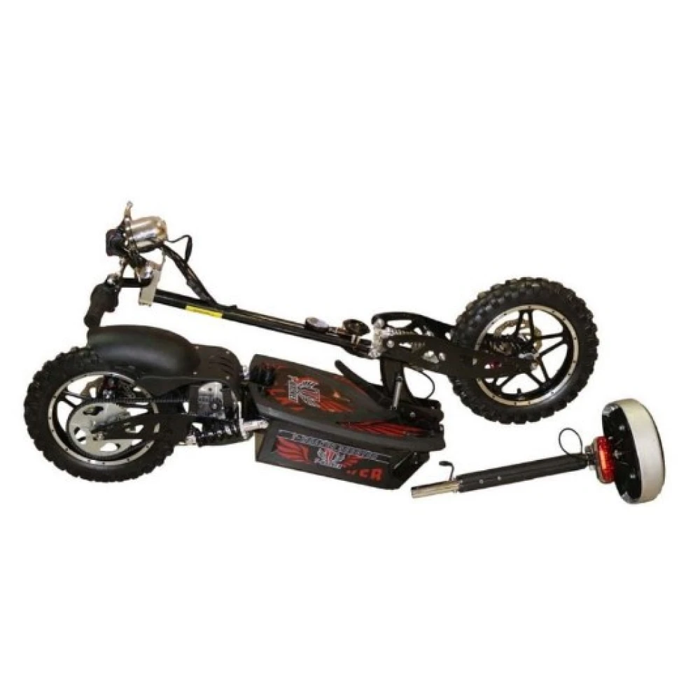 Электросамокат представлен складной конструкцией. Мощное мотор колесо на 1000 Вт в сочетании с электроприводом превращают технику в электроскутер. Согласно рекомендациям производителя вес техники составляет 43 кг, максимальная грузоподъемность – 120 кг, габаритные размеры (146x123x62 см). На одной подзарядке транспортное средство способно проехать до 25 км.